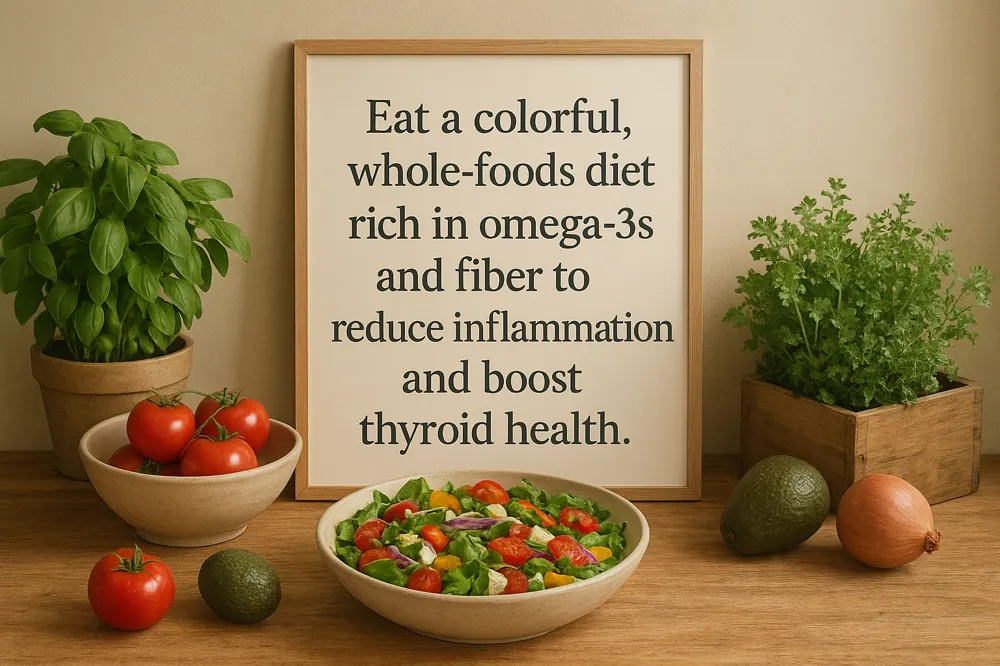 Eating a diet rich in whole, plant-based foods and omega-3 fatty acids supporting thyroid supports thyroid health by providing essential nutrients and antioxidants that reduce inflammation. Leafy greens, fruits, nuts, and whole grains supply vitamins and minerals like selenium, zinc, and vitamin A, which are crucial for hormone production and immune function. Omega-3 fatty acids, found in fatty fish such as salmon and sardines, decrease chronic inflammation—a common thread in autoimmune thyroid conditions like Hashimoto’s thyroiditis—and help maintain healthy cell membranes to facilitate thyroid hormone entry into cells.