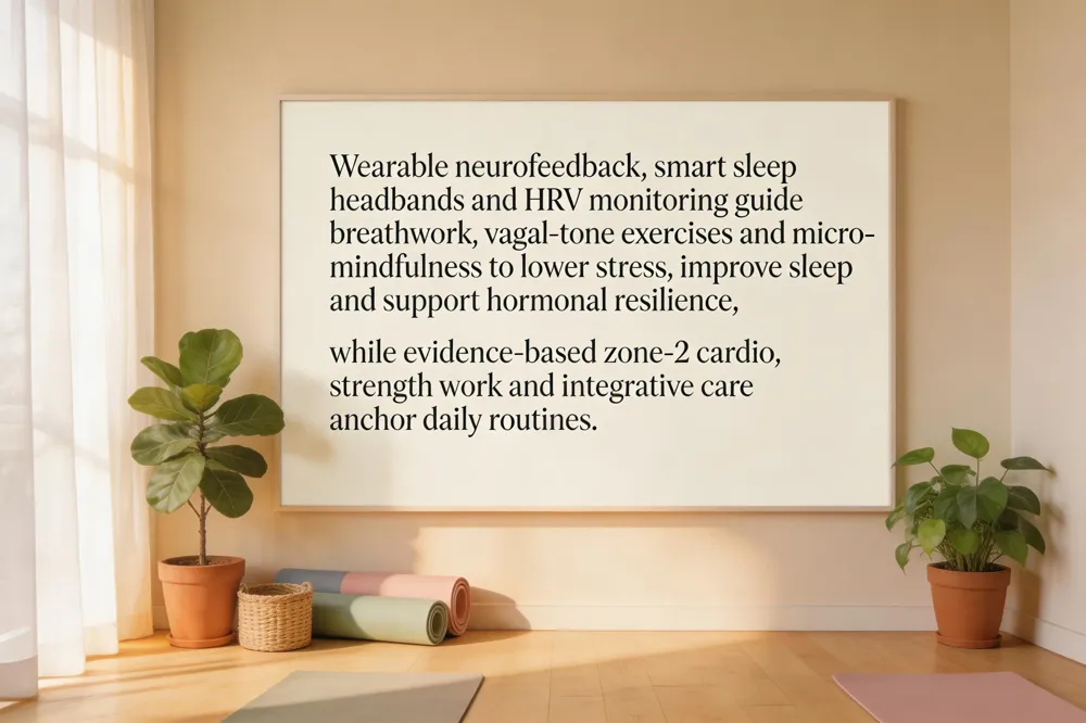 Neurowellness technology is reshaping women’s self‑care by using wearable neurofeedback and smart sleep headbands to monitor heart‑rate variability, cortisol rhythms and brain‑wave patterns. Real‑time data guide breathwork and vagal‑tone exercises—such as 4‑7‑8 breathing and paced exhalation—to engage the parasympathetic nervous system, lower stress and improve sleep quality. Micro‑mindfulness moments, like a three‑minute breathing pause before a meeting or a brief nature‑view break during a commute, embed stress‑reduction into daily routines without demanding extra time.
