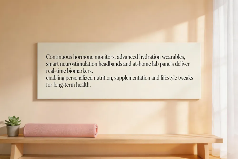 Continuous hormone monitoring devices (e.g., Level Zero’s arm patch) let women track progesterone, estrogen, testosterone and cortisol in real time, revealing cycle variability and early perimenopause signals. Advanced hydration tracking, from sugar‑free electrolyte drinks such as Nonni to Garmin’s pulse‑spectroscopy wearables, ensures functional water intake for active lifestyles and supports metabolic health. Smart neurostimulation tools, including portable EEG headbands and AI‑enhanced sleep sensors, provide personalized nervous‑system regulation and can be synced to menstrual phases for mood balance. Data‑informed health decisions arise from at‑home lab panels and wearable biomarkers that reveal long‑term patterns in glucose, insulin sensitivity, hormone trends and inflammation, guiding targeted nutrition, supplementation and lifestyle tweaks.
