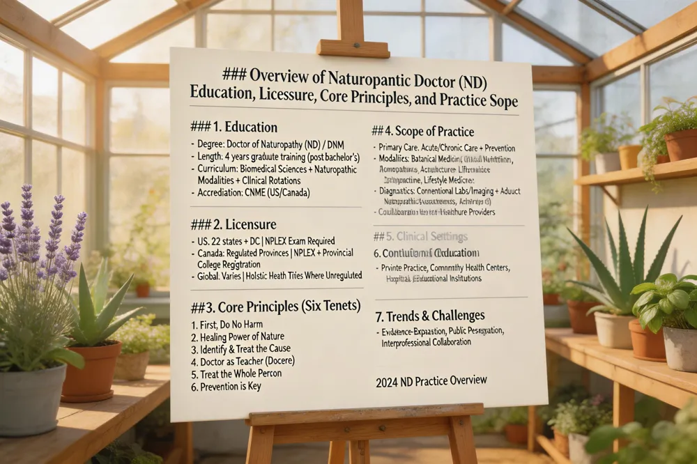 Naturopathic doctors (NDs) in the United States must earn a Doctor of Naturopathic Medicine degree from an accredited four‑year program (≥4,100 hours of classroom and clinical training) and pass the NPLEX exams. Licensure is granted in 26 jurisdictions—including 23 states, the District of Columbia, Puerto Rico and the U.S. Virgin Islands—allowing NDs to diagnose, treat, and prevent illness using natural‑based therapies such as nutrition counseling, botanical and homeopathic medicines, Acupuncture, and mind‑body techniques. Many states also permit IV therapy, minor gynecologic procedures, and primary‑care practice, while prescribing controlled substances is generally prohibited. The six core principles—First Do No Harm, Healing Power of Nature, Identify & Treat the Cause, Treat the Whole Person, Prevention, and Doctor as Teacher—guide every encounter and reinforce the patient‑centered, education‑focused model. Naturopathy is recognized as a legitimate health‑care profession across all 50 states, supported by accredited education, licensure, and growing evidence for chronic‑condition management. Salary expectations vary widely; most NDs earn $80,000‑$150,000 annually, with a median around $103,000 and top earners exceeding $190,000, especially in private practice or specialized clinics.
