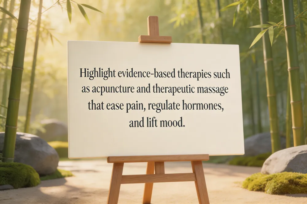 Mind‑body therapy techniques Mind‑body approaches blend mental focus with physical activity or sensory input. Common modalities include yoga, tai chi, qigong, mindfulness meditation, guided imagery, progressive muscle relaxation, acupuncture, and therapeutic massage. These practices are safe when led by trained professionals and can be tailored to women’s hormonal and reproductive health.