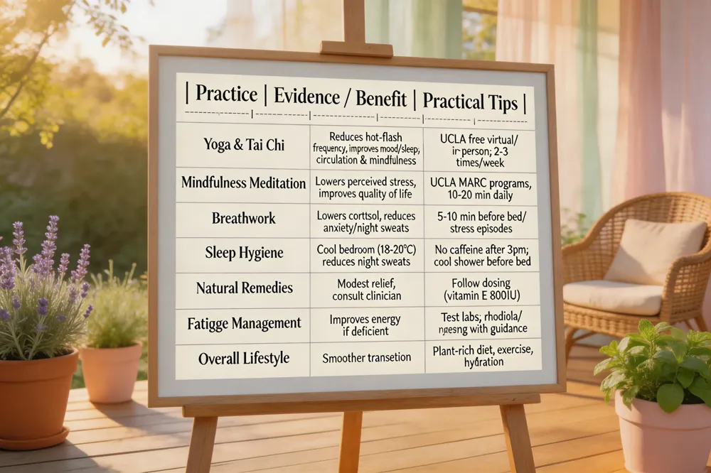 [Yoga & Tai Chi] – Regular classes (virtual or in‑person) improve hot‑flash frequency, mood, and sleep quality by promoting circulation, flexibility, and mindfulness. UCLA’s Integrative Medicine offers free yoga sessions and Tai Chi workshops tailored for menopausal women.