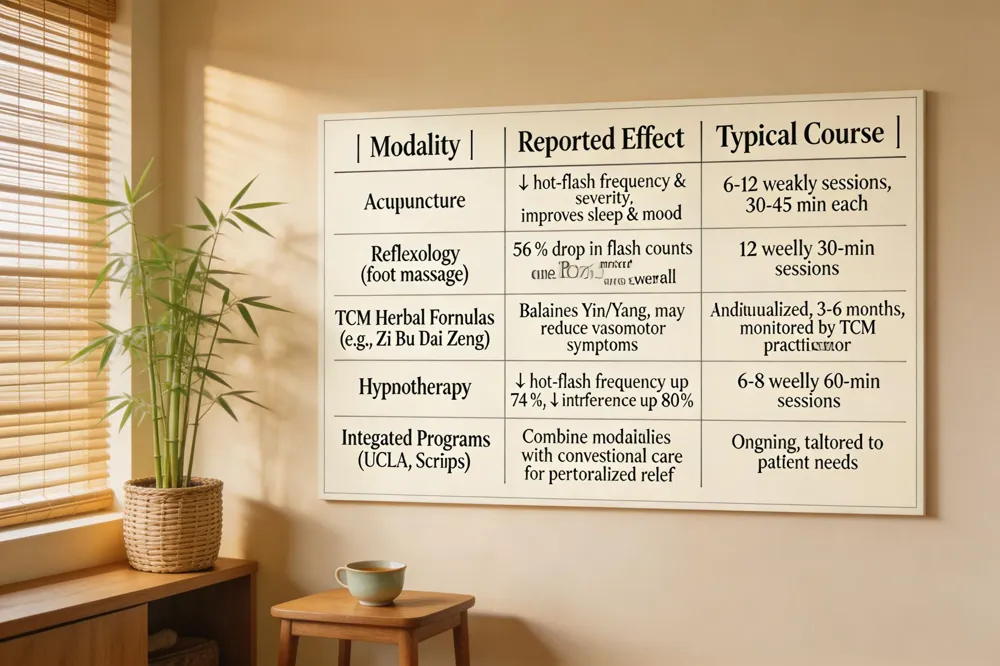 For those interested in integrated care, UCLA Health’s Comprehensive Menopause Program offers personalized, evidence‑based plans that combine hormone therapy, lifestyle counseling, and integrative modalities such as acupuncture, hypnotherapy, and Reflexology. Likewise, the Scripps Center for Integrative Medicine and its Menopause specialists provide a multidisciplinary, whole‑person approach that includes acupuncture, TCM, and mind‑body practices, all coordinated with conventional medical care to optimize comfort and long‑term health. Women can contact UCLA at 310‑794‑7274 or explore Scripps services online to begin a tailored menopause wellness program.