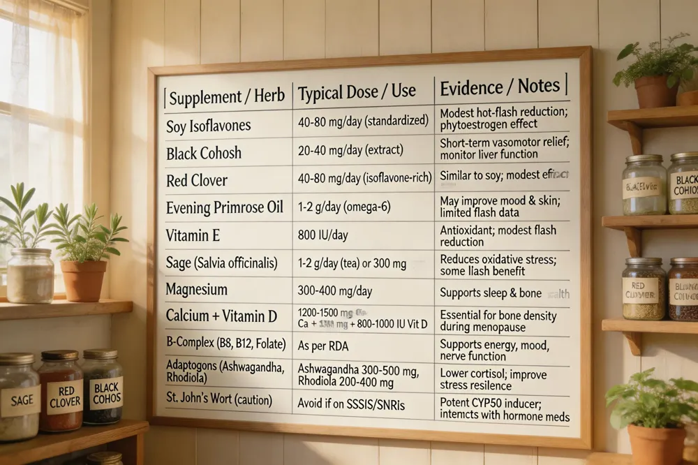 Natural menopause supplements Women frequently turn to phytoestrogen‑rich foods (soy, flaxseed, red clover) and herbs such as black cohosh to evening primrose oil to ease hot flashes, mood swings, and bone‑health concerns. Calcium, vitamin D, magnesium and a B‑complex complex are also recommended for bone density and energy. Because herbal products are not tightly regulated, a clinician should review any regimen for drug‑interaction risks (e.g., St. John’s wort) before use.