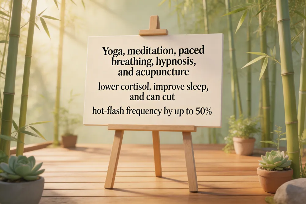 Yoga, meditation and paced breathing (≈6 breaths/min) gently shift the autonomic balance, lowering cortisol and improving sleep—key for hot‑flash and anxiety control. Clinical hypnosis and guided imagery, when delivered by trained therapists, have shown ≥50% reductions in flash frequency and mood‑related distress, offering a drug‑free option for many women. Acupuncture, applied to thermoregulatory points, modestly reduces vasomotor severity and enhances sleep quality, likely by modulating neuro‑vascular pathways.