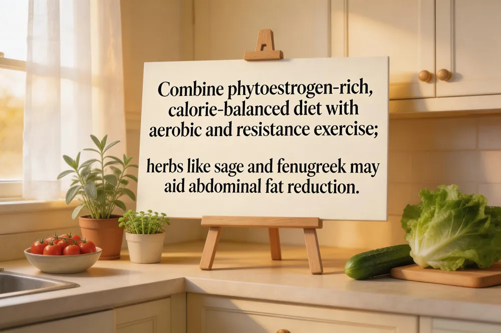 Integrative weight‑management for menopause begins with a phytoestrogen‑rich calorie‑balanced diet. Whole‑food soy, tofu, flaxseed, lentils and legumes supply isoflavones and lignans that modestly ease vasomotor symptoms and support metabolic health, while adequate calcium (1,200‑1,500 mg) and vitamin D (400‑800 IU) protect bone density. Exercise should blend moderate aerobic activity (30 min most days) with resistance training 2‑3 times weekly to preserve lean muscle, improve insulin sensitivity, and curb central fat gain. Mind‑body practices such as yoga or tai‑chi add stress‑reduction benefits that further aid weight control. Herbal options that have shown modest effects on abdominal fat include black cohosh, red clover, sage and fenugreek, all of which contain phytoestrogens or compounds that may improve insulin sensitivity and appetite regulation. Because evidence for direct weight‑loss is limited, these herbs are best used under professional guidance and combined with nutrition and exercise. A sustainable plan also involves sleep hygiene, stress‑management coaching, and regular monitoring of hormone and metabolic markers to personalize interventions. Personalized coaching helps translate these evidence‑based strategies into daily habits.