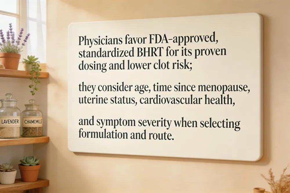Clinicians weigh several factors before recommending hormone therapy. Regulatory and quality‑control concerns: Most compounded bioidentical hormones are not FDA‑approved, so dose accuracy, purity and safety cannot be guaranteed. Professional societies therefore favor FDA‑regulated products that have undergone rigorous testing. Evidence base for safety and efficacy: Large trials (e.g., WHI) showed that bioidentical formulations are not more effective or safer than conventional HRT; claims of a “natural” or “personalized” advantage lack solid data. When clinicians prefer FDA‑approved products: Approved transdermal estradiol patches, oral micronized progesterone and other standardized doses provide consistent delivery, lower clot risk, and clear labeling, making them the default choice for most patients. Patient‑specific factors influencing prescription: Age (<60 y), timing within ten years of menopause, a uterus (requiring progestogen protection), cardiovascular health, history of clotting or cancer, and personal symptom severity all guide individualized dosing and route selection.