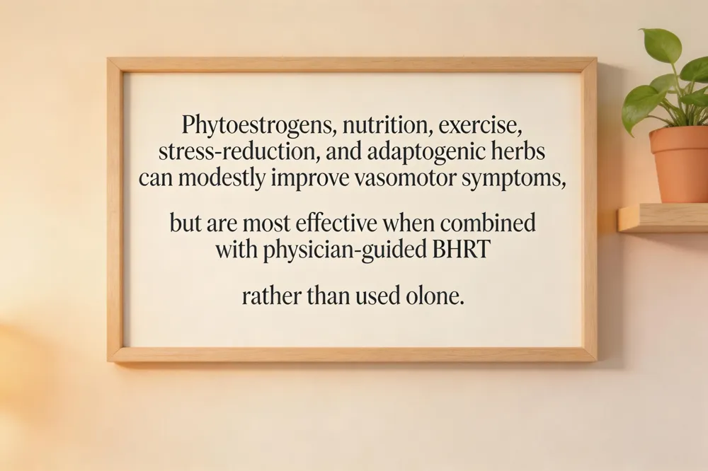 Evidence shows that non‑pharmacologic measures (dietary phytoestrogens, stress management, adequate sleep) may modestly improve vasomotor symptoms and mood, but they are most effective when used alongside physician‑based BHRT rather than as stand‑alone therapies.
