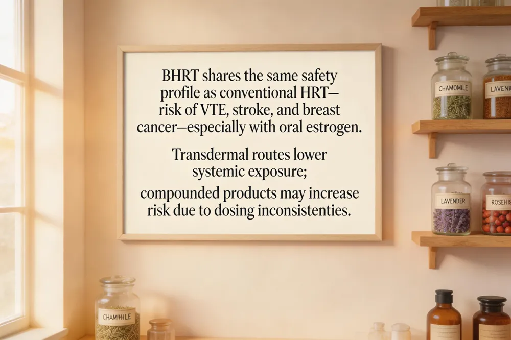 Bioidentical hormone replacement therapy (BHRT) follows the same safety profile as FDA‑approved conventional HRT. Combined estrogen‑plus‑progestogen regimens modestly raise breast‑cancer risk—about three extra cases per 1,000 women over five years—especially with oral preparations. Transdermal or low‑dose routes lower systemic exposure and may reduce this risk, but long‑term data remain limited. The two most severe adverse outcomes are breast cancer and venous thromboembolism (VTE). Estrogen promotes clotting factors, increasing the odds of deep‑vein thrombosis, pulmonary embolism, stroke, and, indirectly, heart disease.