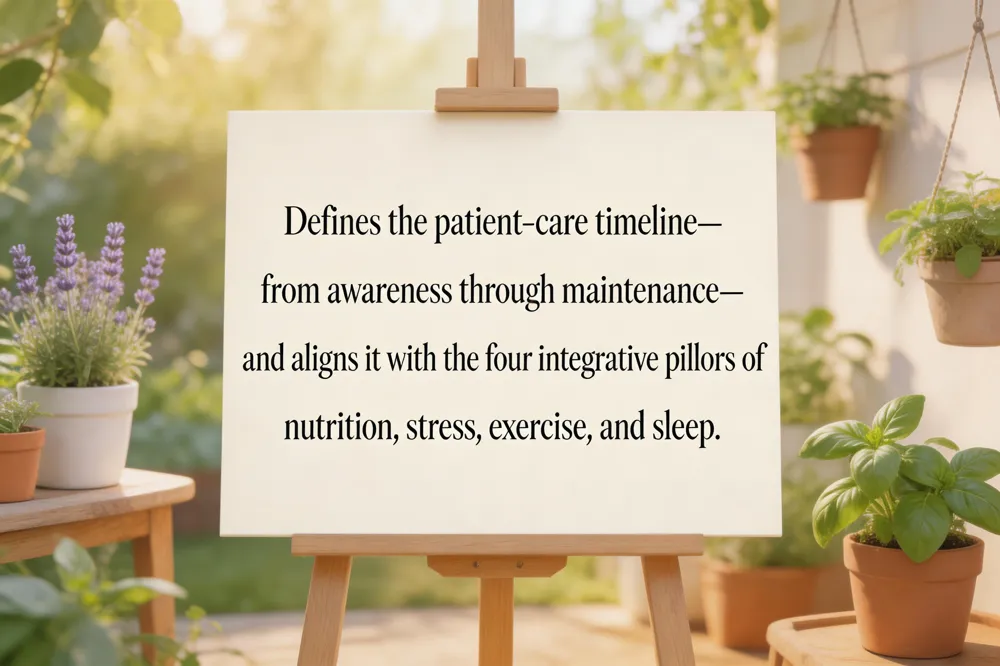 A patient‑centric timeline weaves together a comprehensive intake (physical exam, mental‑health screens, SDOH questionnaire), SMART goal‑setting, functional‑lab‑guided interventions, and the therapeutic order’s stepwise modalities—from diet and movement to botanicals, supplements, and, when needed, conventional referrals. By using motivational interviewing and shared decision‑making, women become co‑authors of their care plan, selecting goals that reflect personal values, cultural beliefs, and life‑stage priorities such as menstrual health, fertility, bone density, and hormonal balance. Clinicians support this empowerment through plain‑language documentation, teach‑back verification, and regular PROM monitoring, while interprofessional partners (dietitians, counselors, community navigators) close the loop. The next step for patients is to engage in the first 0‑2‑week foundation phase—nutrition, gentle movement, stress‑reduction—while clinicians schedule follow‑up labs and SMART‑goal reviews every 4‑6 weeks, ensuring the timeline remains dynamic, evidence‑based, and truly woman‑focused.