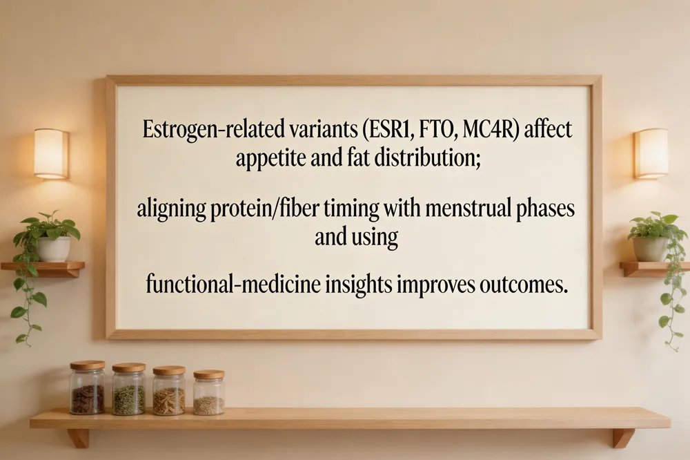 Women’s weight regulation is shaped by estrogen‑related gene variants such as ESR1, FTO, and MC4R, which affect appetite, satiety, and fat distribution across menstrual phases. Aligning nutrient timing with hormonal cycles—e.g., higher protein and fiber during the luteal phase and lighter carbs in the follicular phase—supports stable blood‑glucose and reduced cravings. An integrative functional‑medicine approach combines DNA insights with gut‑microbiome analysis, hormone panels, stress‑management, and sleep optimization to address the root causes of weight resistance.