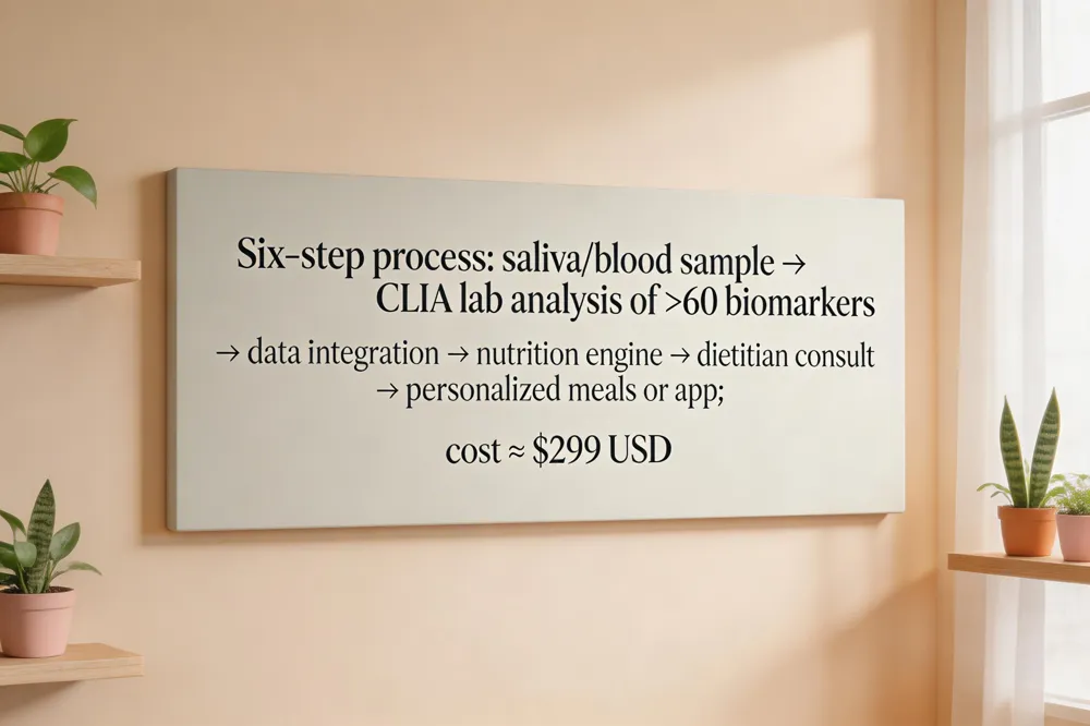 Companies such as Habit create a personalized plan in six steps: (1) saliva swab and blood spot, (2) lab analysis of >60 biomarkers, (3) integration with reported data, (4) a nutrition engine matching genes to foods, (5) a dietitian consult, (6) meal delivery or app. Cost $299 USD; add‑ons cost more. Samples are processed in CLIA‑certified labs, encrypted and never sold. The Academy notes DNA‑based advice isn’t routine care; the FDA treats panels as wellness tools. Dietitians translate SNP data into nutrient ratios, supplement plans, and hormone strategies for women.