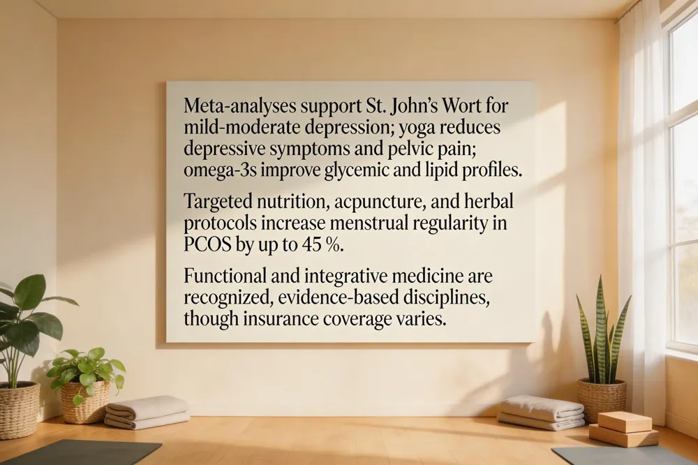 Naturopathic and integrative practitioners rely on a growing body of peer‑reviewed evidence to address women’s health concerns. St. John’s Wort for depression has been shown in meta‑analyses to be as effective as conventional antidepressants for mild‑to‑moderate depression, with a more favorable safety profile, making it a viable first‑line option when patients prefer botanical therapy. Yoga and mind‑body benefits consistently reduce depressive symptoms and pelvic pain, and improve stress resilience; regular practice is a cornerstone of naturopathic lifestyle counseling for hormonal and psychological balance. Omega‑3 fatty acids (e.g., EPA/DHA) improve glycemic control and lipid profiles in type‑2 diabetes, supporting the naturopathic emphasis on diet‑first interventions. PCOS and menstrual health studies demonstrate that personalized nutrition, acupuncture, and herbal protocols can increase menstrual regularity by up to 45 % and lower androgenic symptoms, underscoring the value of root‑cause, patient‑centered treatment plans.