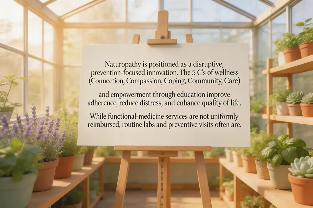 Naturopathy is poised to act as a disruptive innovation in health care by shifting focus from reactive, procedure‑driven models to prevention‑oriented, patient‑centered care that reduces iatrogenic harm and costs. Central to this shift are the 5 C’s of wellness: Connection, Compassion, Coping, Community, and Care. These pillars nurture supportive relationships, kindness, effective stress‑management strategies, social participation, and proactive self‑maintenance (nutrition, sleep, preventive care). Empowerment through education is a cornerstone of naturopathic practice. Practitioners build therapeutic relationships, engage in shared decision‑making, and act as teachers, enhancing health literacy and self‑agency. Research shows that such empowerment improves adherence, reduces pain and emotional distress, and boosts quality of life. While functional‑medicine services are not uniformly covered by insurance, many plans reimburse routine labs and preventive visits; out‑of‑network or specialized services may be paid with HSAs/FSAs or cash‑pay. This integrated, evidence‑based approach promises healthier outcomes and a more active role for patients in their wellness journey.