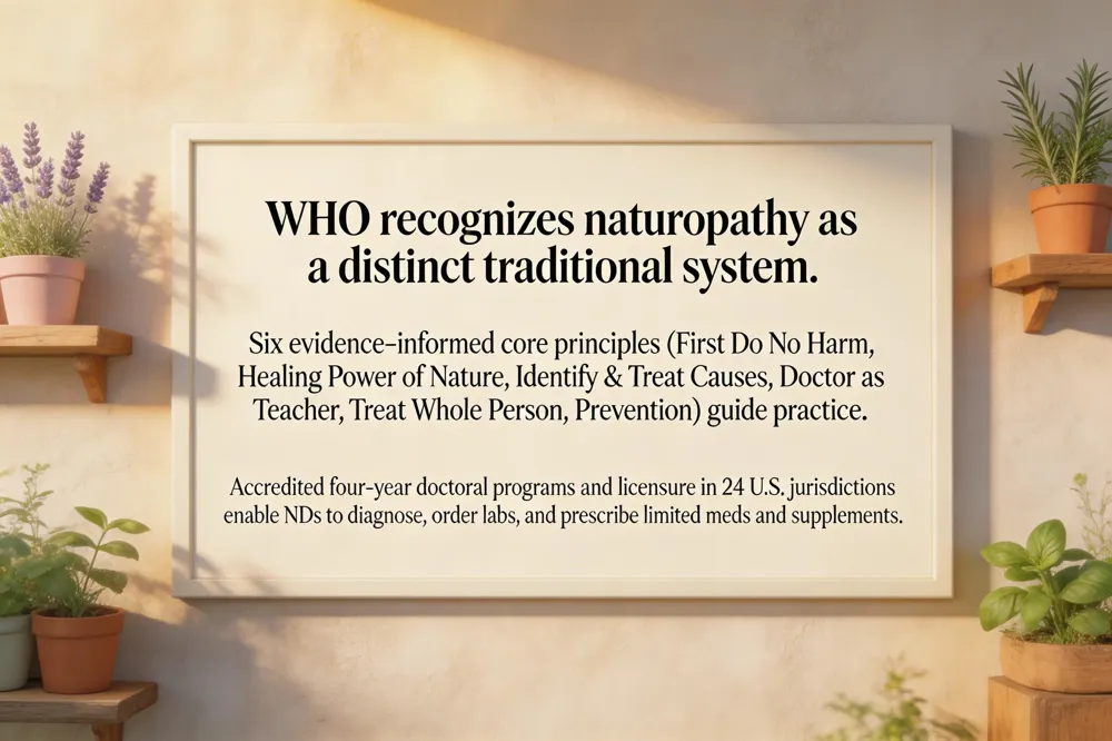 Naturopathy is recognized by the World Health Organization as a distinct system of traditional and complementary medicine, validating its global relevance and encouraging research‑based integration with mainstream health services.