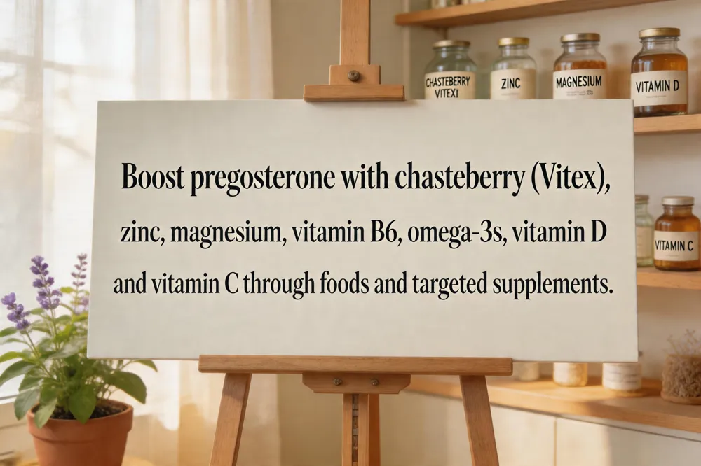 Chasteberry (Vitex agnus‑castus) is the most studied herb for supporting luteal‑phase progesterone; it helps balance LH surge and promote ovarian synthesis. Minerals include zinc (pumpkin seeds, oysters) and magnesium (spinach, nuts, dark chocolate), cofactors for the enzymes that convert cholesterol into progesterone. Vitamin B6 (sunflower seeds, fish, bananas) supports enzymatic pathways and reduces estrogen dominance. Omega‑3 fatty acids from salmon, flaxseed, or algae lower inflammation and improve luteal function. Vitamin D (fish, fortified foods) enhances insulin sensitivity and supports steroid hormone production, while Vitamin C (citrus, bell peppers) protects adrenal glands and aids cortisol regulation.
