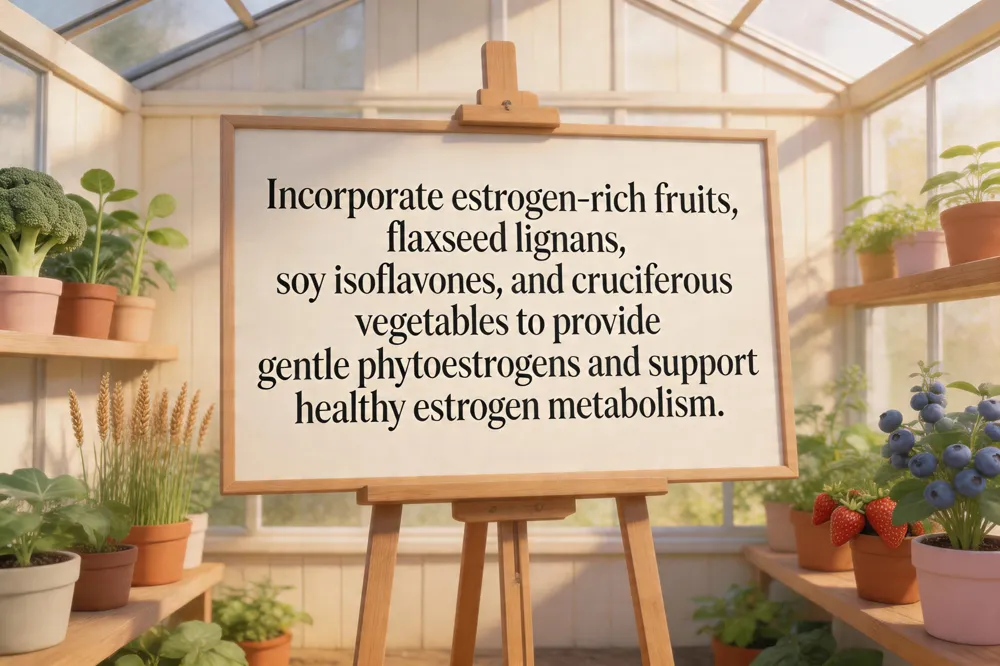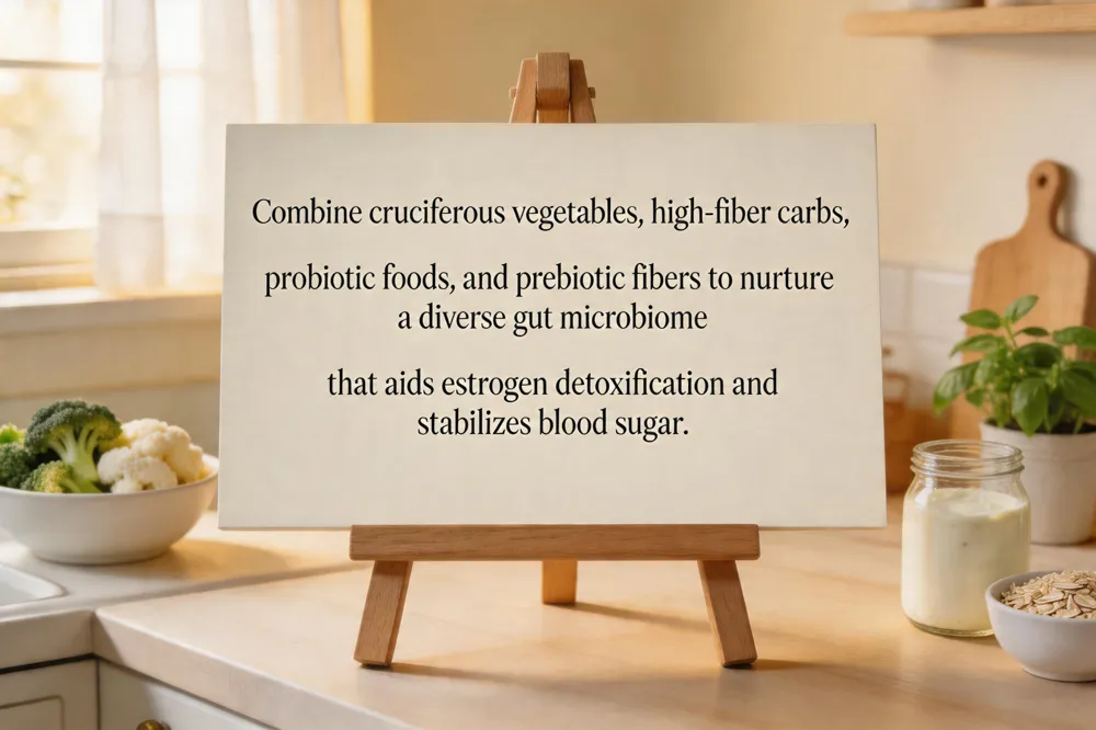 To stabilize estrogen, prioritize cruciferous veg, whole grains and fatty fish. Vitamin C‑rich berries aid insulin control and reduce oxidative stress.
