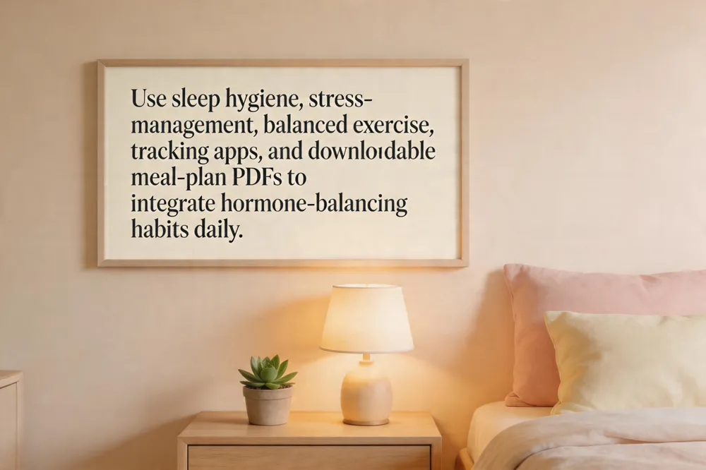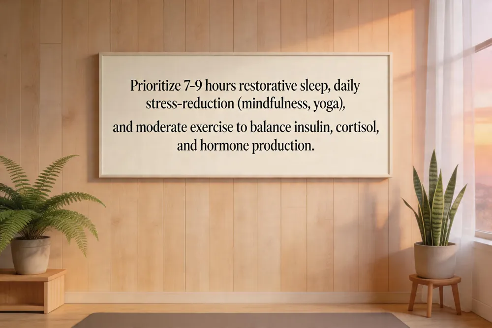 Sleep hygiene – Aim for 7‑9 hours of uninterrupted sleep; keep bedroom cool, dark, limit screens, and maintain a consistent bedtime. Quality rest regulates cortisol, melatonin, insulin and supports the hypothalamic‑pituitary‑ovarian axis.