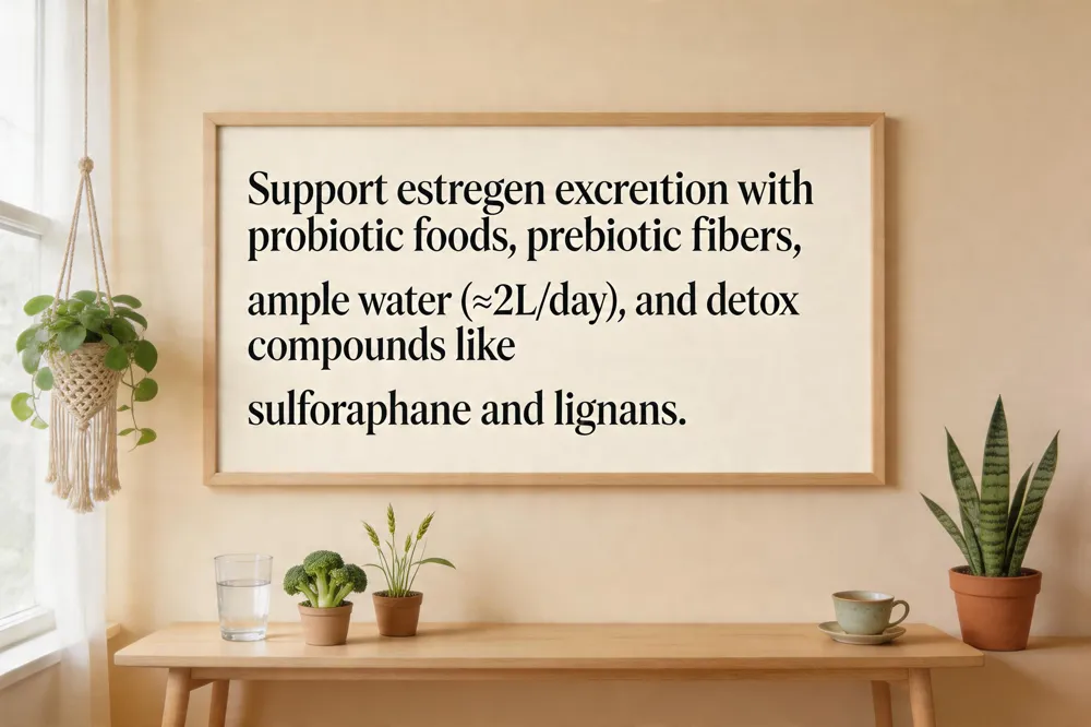 Probiotic foods such as yogurt, kefir, kimchi, sauerkraut, and kombucha support beneficial gut bacteria that help metabolize estrogen and support its excretion. Pair them with prebiotic fibers found in garlic, onions, bananas, oats, legumes, and whole‑grain breads; these fibers feed the microbiome, increase short‑chain fatty acids, and improve insulin sensitivity. Hydration guidelines recommend at least 8 cups (≈2 L) of water daily, or roughly half of body weight in ounces, to flush toxins, keep blood volume stable, and aid liver detoxification. Detoxifying compounds include sulforaphane and indole‑3‑carbinol from cruciferous vegetables, lignans from flaxseed, and polyphenols from berries and green tea, all of which bind excess estrogen in the gut and promote its removal. Natural remedies focus on whole‑food nutrition, stress‑reduction, adequate sleep, and moderate movement; to raise progesterone naturally prioritize zinc, magnesium, vitamin C, B‑vitamins, healthy fats, restorative sleep, and stress‑reduction. Foods that stabilize estrogen are veg, flaxseed, omega‑3‑rich fish, and probiotic‑rich fermented foods. Hormone‑disrupting foods include excess red meat, refined sugars, high caffeine, and certain soy products.