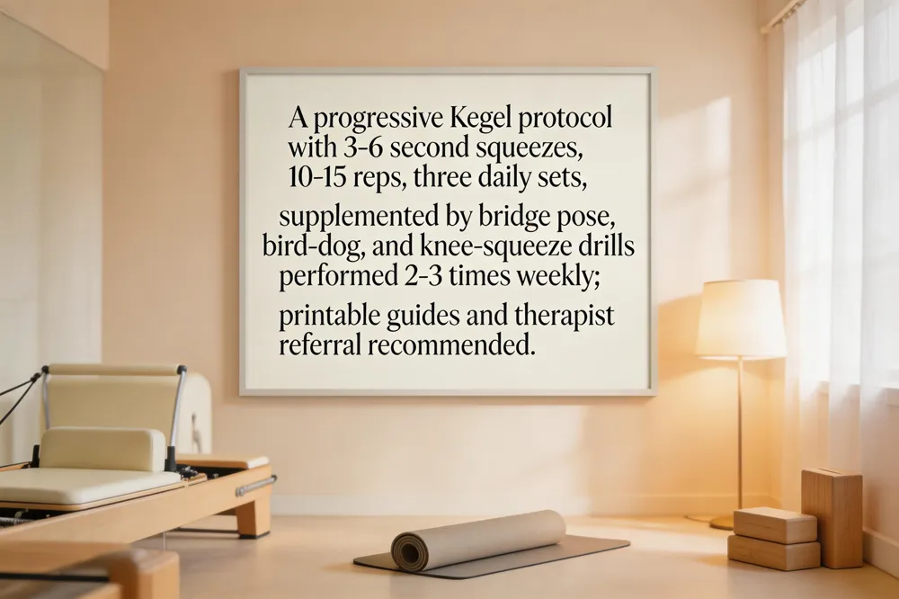 Pelvic floor health begins with learning how to activate the right muscles. A simple way to identify them is by trying to stop the flow of urine or by holding back gas; you should feel a gentle lift in the vaginal, bladder, and rectal area without engaging the abdomen, thighs, or buttocks. Once you can feel the contraction, perform a basic Kegel: squeeze for 3–6 seconds, then relax for 6–10 seconds. Aim for 10–15 repetitions, three sets per day, and practice in lying, seated, and standing positions.