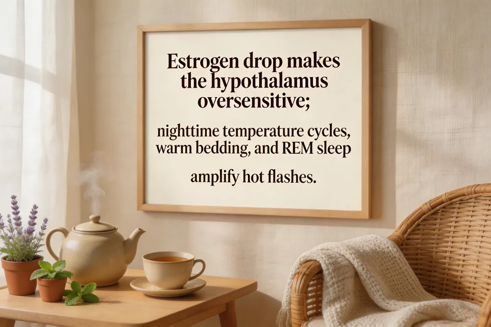Why are hot flashes worse at night? Hot flashes tend to feel worse at night because the estrogen drop makes the hypothalamus over‑sensitive, and the natural temperature fluctuations of sleep—combined with warm bedding or clothing—trap heat. Fatigue, stress and the lack of daytime distractions lower tolerance, while REM sleep’s vulnerability to disruption magnifies the feeling.