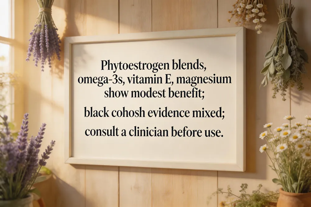 Ther hot‑flashes and night‑sweats, many women turn to plant‑based supplements. phytoestrogen blends—soy isoflavones, red‑clover extract, and ground flaxseed—contain weak estrogenic compounds that have been shown in several trials to modestly lower flash frequency and intensity. Omega‑3 sources such as flaxseed oil or fish‑oil capsules, together with vitamin E (400–800 IU daily) and magnesium, support vascular stability and may blunt the temperature spikes that trigger flashes.