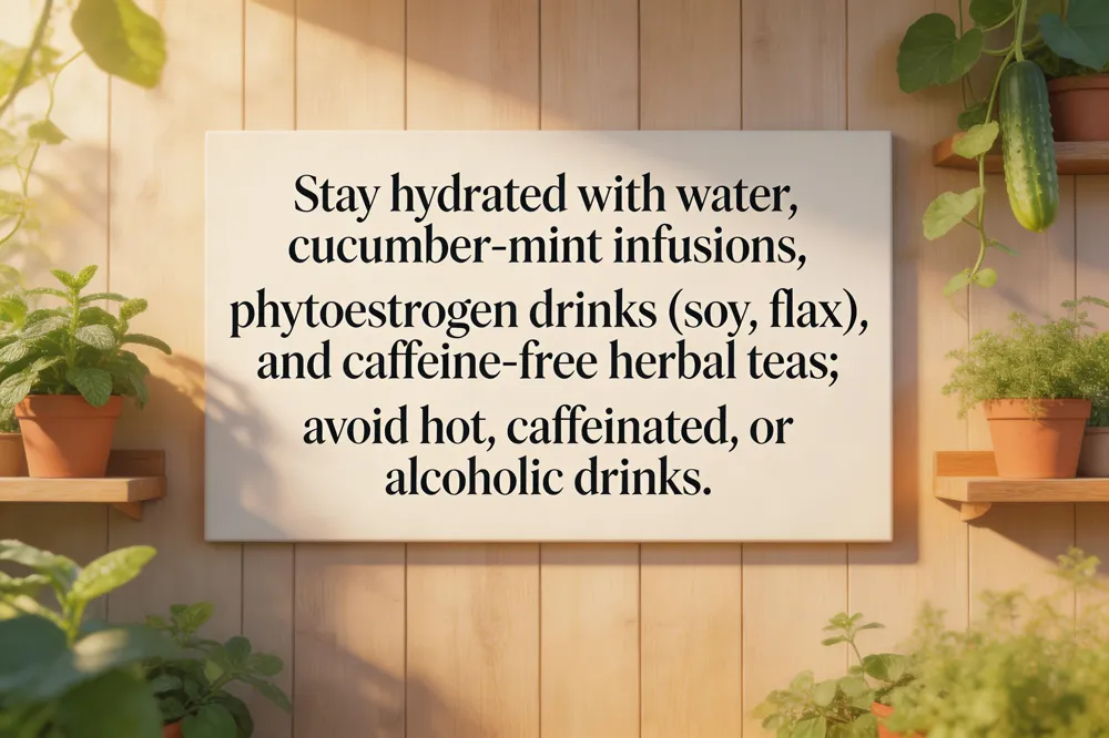 Staying well‑hydrated is one of the simplest ways to keep the body’s thermostat from over‑reacting during a hot flash. Plain water, especially when lightly infused with cucumber, mint, or a squeeze of lemon, provides a cooling effect and helps the body dissipate heat more efficiently. Phytoestrogen‑rich drinks such as soy milk, soy‑based smoothies, or fortified soy yogurt contain isoflavones that loosely bind estrogen receptors and have been shown in several studies to modestly lower flash‑flash frequency and intensity. Adding a tablespoon of ground flaxseed or a splash of flaxseed oil to a smoothie supplies both omega‑3 fatty acids and lignans, which support hormone balance and may reduce the severity of flashes. Caffeine‑free herbal teas—chamomile, peppermint, rooibos, or lemon‑ginger blends—offer a soothing, warm‑yet‑non‑stimulating sip that can calm the nervous system without the vasoconstrictive trigger that caffeine provides. In general, drinking 8‑10 cups of fluid a day (water, herbal tea, or low‑sugar fruit‑infused drinks) helps maintain optimal blood volume and skin temperature regulation, making sudden heat waves less likely to spiral into a full‑blown flash. Avoid hot, caffeinated, or alcoholic beverages, as they can provoke or worsen vasomotor symptoms.