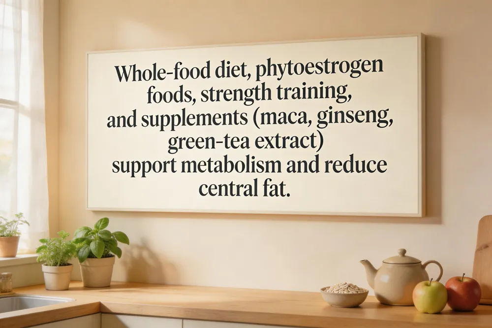 Natural remedies for menopause weight gain A whole‑food diet—lean protein, high‑fiber vegetables, healthy fats, and phyto‑estrogen sources such as soy, flaxseed, and legumes—stabilizes blood sugar and curbs cravings. Strength‑training and brisk aerobic activity preserve muscle, boost resting calorie burn, and target mid‑section fat. Herbal nutrients like black cohosh, red clover, maca, vitamin D, and omega‑3 fatty acids may support estrogen pathways and reduce inflammation, but should be used under clinician guidance. Adequate sleep, stress‑reduction (yoga, meditation), and hydration complete a holistic plan.
