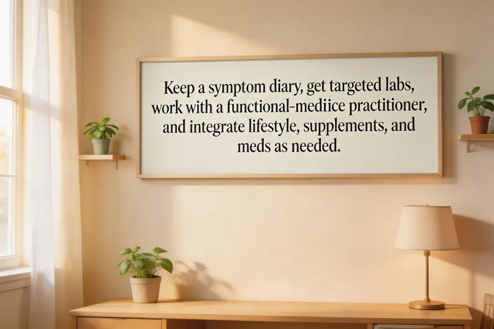Start by keeping a personal symptom diary: note the time, duration, triggers (caffeine, stress, heat, clothing), and perceived severity of each hot flash. This data helps you and your clinician spot patterns and evaluate interventions. Schedule a collaborative visit with a functional‑medicine practitioner who can order targeted labs (hormone panels, thyroid, inflammatory markers) and tailor a plan that blends evidence‑based lifestyle changes, safe supplements, and, when needed, prescription options such as low‑dose SSRIs, gabapentin, or NK3‑receptor antagonists.