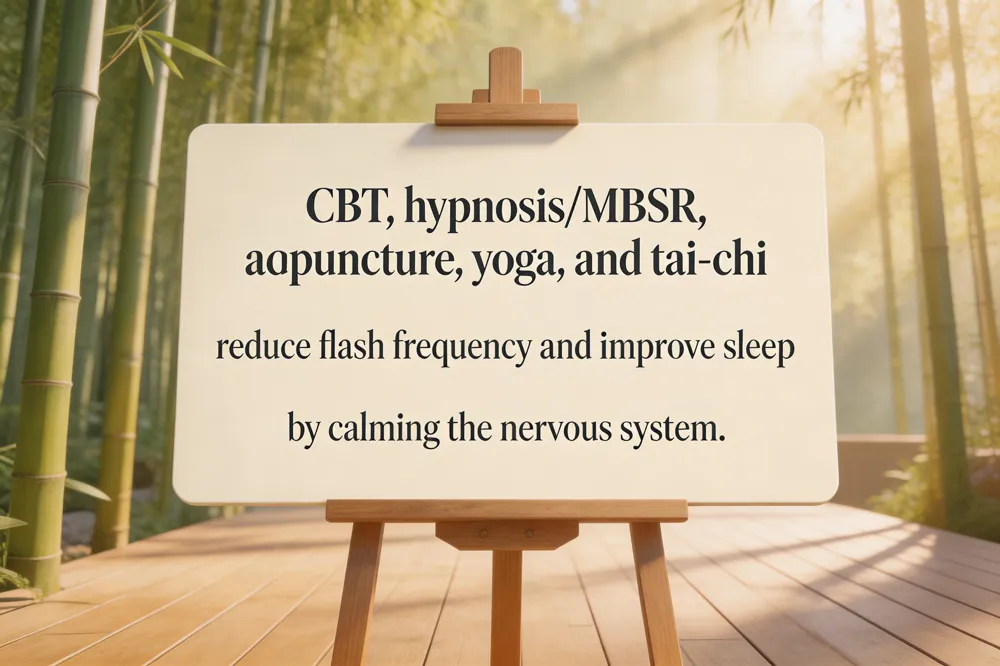 Hypnosis and mindfulness‑based stress reduction (MBSR) have the strongest evidence among mind‑body approaches; randomized studies report ≥50 % reductions in flash frequency and improved sleep quality. Guided imagery, paced breathing (4‑4‑6 pattern) and regular meditation calm the sympathetic nervous system, making the hypothalamic temperature‑regulation center less reactive.