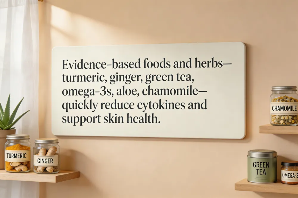 Anti‑inflammatory herbs for skin – Aloe vera gel soothes redness; Roman chamomile (apigenin‑rich) calms irritation; Calendula officinalis (triterpenoid saponins) supports healing; Green‑tea extract (catechins) blocks cytokine release; Turmeric (curcumin) modulates NF‑κB, making it useful for eczema or psoriasis.