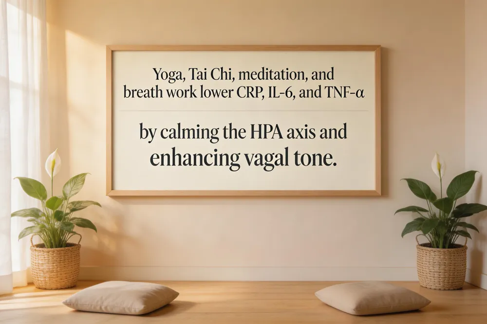 Chronic low‑grade inflammation underlies many women’s health concerns—menstrual irregularities, PCOS, endometriosis, menopausal vasomotor symptoms, and autoimmune disorders. The inflammatory tone is not static; psychological stress, cortisol spikes, and hormonal fluctuations (estrogen, progesterone, adrenal hormones) continuously signal immune cells, often amplifying cytokine production such as CRP, IL‑6, and TNF‑α. Integrative and functional‑medicine models view these pathways as interconnected. By assessing stress‑related cortisol patterns, gut dysbiosis, and hormone balance, clinicians can personalize mind‑body interventions—yoga, tai chi, meditation, breath work—that lower sympathetic output, boost parasympathetic tone, and modulate the HPA axis. Clinical trials consistently show reductions in NF‑κB activity, modest drops in CRP and IL‑6, and improved sleep and mood after 12‑16 weeks of regular practice. When combined with anti‑inflammatory nutrition, adequate sleep, and targeted supplements, mind‑body therapies become a cornerstone of a low‑risk, patient‑centered strategy to tame inflammation and support women’s overall wellness.