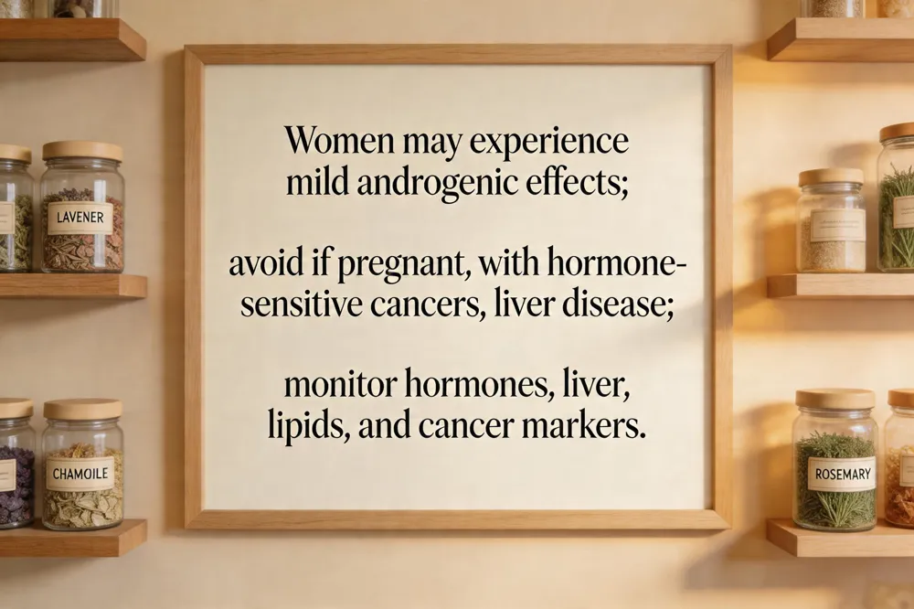 When women consider DHEA, the most common androgenic side effects are mild and reversible: oily skin, acne, hair thinning, and unwanted facial or body hair (hirsutism). Some women also report menstrual irregularities, mood swings, or occasional headaches. Less frequent but more serious concerns include changes in liver enzymes, lowered HDL cholesterol, and a potential rise in hormone‑sensitive cancers such as breast or ovarian cancer. Because DHEA is a precursor to estrogen and testosterone, it should be avoided by anyone who is pregnant, breastfeeding, has a history of estrogen‑dependent cancers, liver disease, or uncontrolled diabetes. Women taking medications that affect hormone pathways—including antipsychotics, SSRIs, hormone therapies, or blood thinners—should consult a qualified practitioner before starting DHEA. Monitoring should include baseline and follow‑up hormone panels (DHEA‑S, testosterone, estradiol), liver function tests, lipid profiles, and, when appropriate, cancer screenings. In women with low DHEA‑S, modest supplementation (25–50 mg daily) may improve ovarian reserve markers, mild depressive symptoms, skin hydration, and vaginal dryness, but benefits are limited and must be weighed against the risks. Regular follow‑up every 3–6 weeks helps ensure safety and adjust dosing as needed.