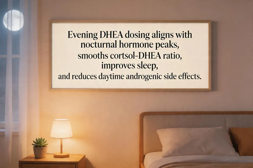 DHEA follows a natural diurnal pattern that peaks in the early morning and falls throughout the day, mirroring cortisol’s rhythm. Taking the supplement in the evening can help smooth the cortisol‑DHEA ratio during the night, reducing stress‑related cortisol spikes that interfere with sleep and allowing melatonin to act more effectively. An evening dose taken with a light meal improves gastrointestinal absorption without the breakfast‑related stomach upset that some people experience. For women who use the FDA‑approved prescription vaginal insert (Intrarosa), the regimen is a 6.5 mg insert placed at bedtime each night, delivering DHEA directly to the genital tissues while supporting overnight hormonal recovery. Typical oral dosing for adults ranges from 25 mg to 50 mg per day; clinicians often recommend the dose be taken before sleep to align with the body’s nocturnal hormone surge and to minimize daytime androgenic side effects such as acne. Higher doses (>75 mg) are reserved for short‑term, medically supervised use because they increase the risk of estrogen‑ or testosterone‑related adverse events. Always discuss timing and dose with a qualified healthcare professional, especially if you have hormone‑sensitive conditions or are on other medications.