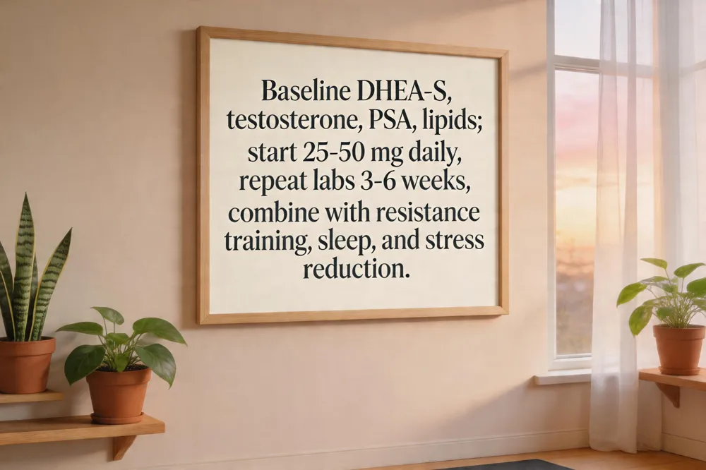A personalized DHEA protocol begins with a baseline lab panel (DHEA‑S, testosterone, PSA, lipid profile) to confirm a true deficiency and rule out contraindications such as prostate cancer or liver disease. Most clinicians start with 25‑50 mg taken each morning, matching the hormone’s natural diurnal rise, and adjust based on repeat testing after 4‑6 weeks. The supplement works best when paired with restorative sleep, adequate protein and healthy fats, and regular resistance or high‑intensity training, which together support endogenous hormone production and lean‑mass maintenance. Ongoing monitoring—every 3‑6 months—helps catch side effects (acne, mood changes, altered cholesterol) and ensures safety. Always involve a qualified healthcare professional to interpret labs, manage drug interactions, and tailor the regimen to your individual health goals.