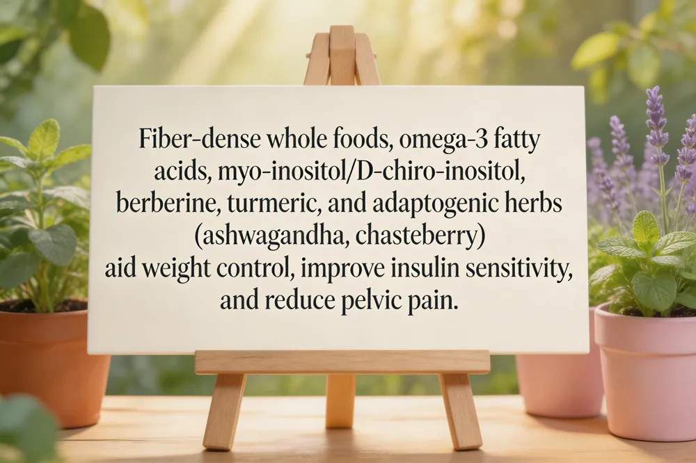 Anti‑inflammatory botanicals—turmeric, ginger, cinnamon—can be taken as teas or capsules. Adaptogens (maca, ashwagandha, vitex) support hormonal balance and may ease menstrual cramps. A magnesium‑rich diet, probiotic foods and occasional acupuncture further reduce pelvic discomfort.