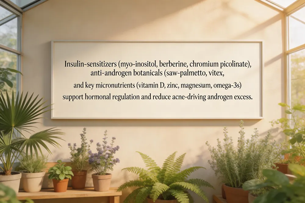 Insulin‑sensitizing agents such as myo‑inositol combined with D‑chiro‑inositol (40:1), berberine, and chromium picolinate improve glucose metabolism and lower circulating insulin, which in turn reduces ovarian androgen production. Androgen‑lowering botanicals—including saw‑palmetto, vitex agnus‑castus, cinnamon, and green‑tea catechins—modulate steroidogenic enzymes and 5‑α‑reductase activity, helping to tame sebum output. Key vitamins and minerals—vitamin D, zinc, selenium, magnesium, and omega‑3 fatty acids—provide anti‑inflammatory, antioxidant, and hormone‑balancing support.