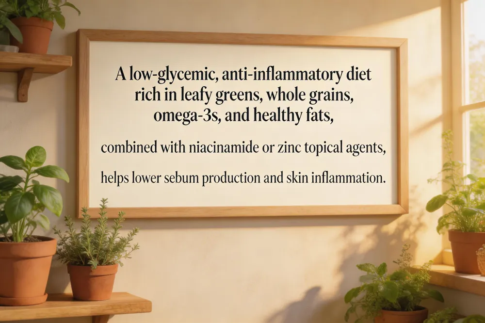 For oily skin, pair the diet with topical niacinamide (2‑5 %) or zinc pyrithione to regulate sebum and gentle chemical exfoliants (salicylic or azelaic acid) 2‑3 times weekly.
