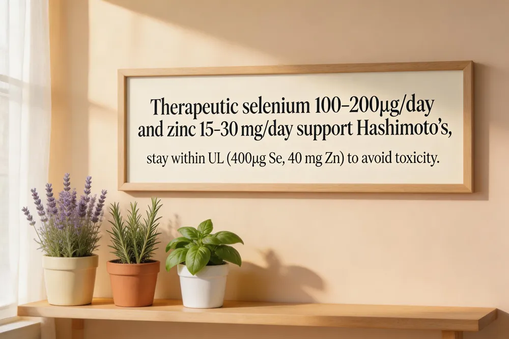 For Hashimoto’s thyroiditis, clinical trials support a therapeutic selenium dose of 100‑200 µg / day, preferably as organic selenomethionine or selenium‑enriched yeast. Six months of supplementation modestly lowers anti‑TPO antibody titers by 30‑50 % when baseline selenium is low; doses >200 µg add little benefit and raise toxicity risk. Women with hypothyroidism are advised to aim for 15‑30 mg elemental zinc daily (e.g., zinc picolinate or glycinate), exceeding the basic RDA of 8 mg to support T4‑to‑T3 conversion and TSH synthesis. The tolerable upper intake levels are 400 µg for selenium and 40 mg for zinc; excess intake can cause selenosis (hair loss, gastrointestinal upset) or copper depletion, which may worsen thyroid autoimmunity. Normal thyroid laboratory ranges for adult females are TSH 0.4‑4.0 mU/L and free‑T4 0.8‑1.8 ng/dL, with slight shifts during pregnancy or aging. Individual dosing should be guided by serum selenium and zinc testing to stay within safe, effective windows.