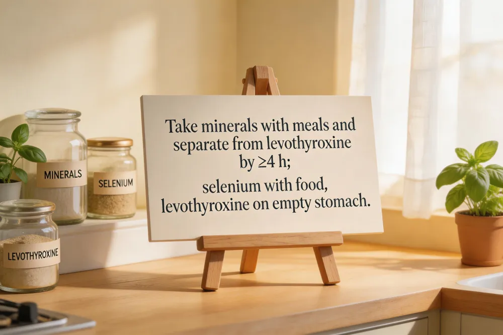 Can levothyroxine be taken together with selenium? Yes, but take levothyroxine on an empty stomach and wait 30–60 minutes before selenium or any other supplement. Selenium 100–200 µg/day is safe alongside hormone replacement.