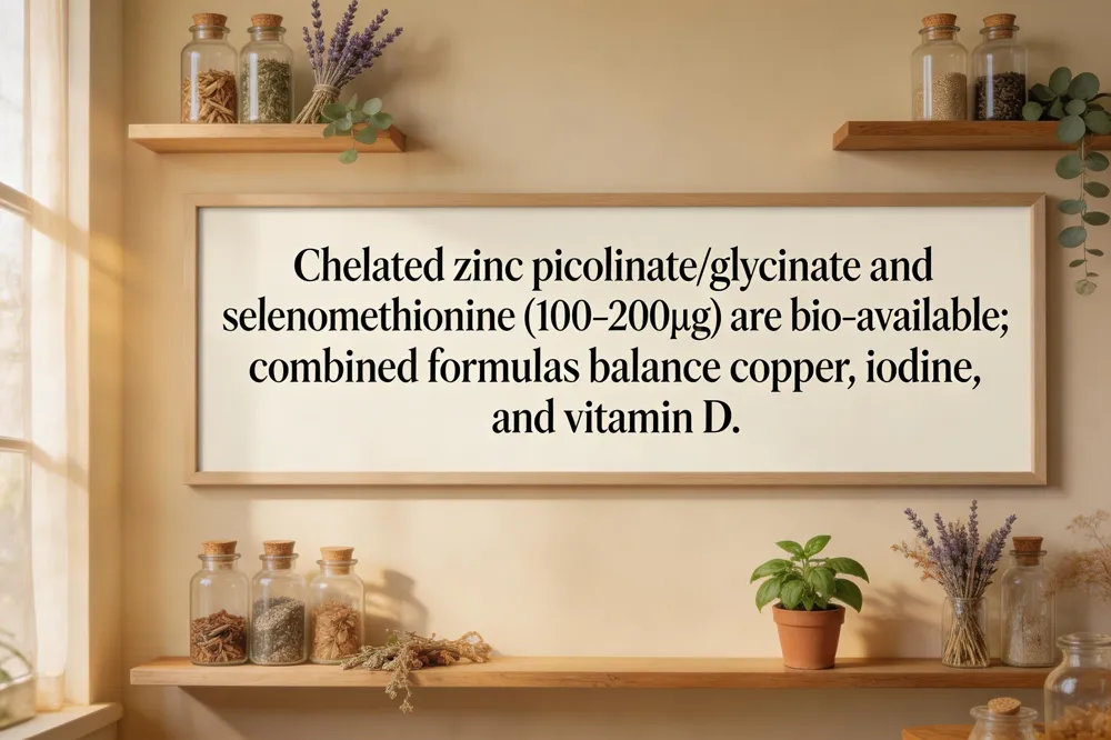 The most bio‑available zinc for thyroid support is chelated zinc picolinate or zinc glycinate (15‑30 mg elemental daily), paired with a modest copper supplement to prevent deficiency. For Hashimoto’s, the same chelated zinc dose (20‑30 mg) aids T4‑to‑T3 conversion and immune regulation. Organic selenomethionine (100‑200 µg/day) is the preferred selenium form because it efficiently fuels deiodinases and glutathione peroxidase. Combined products such as Dr. Mercola Zinc Plus Selenium (30 mg zinc glycinate, 200 µg selenomethionine, copper) or Nation Health MD Thyro Support (15 mg zinc, 200 µg selenium, iodine) offer balanced ratios. Clinical trials in overweight hypothyroid women show zinc ↑free ↑T3, ↓TSH and higher metabolic rate; selenium ↓ anti‑TPO antibodies and protects thyroid cells. Low selenium impairs deiodinases, reducing T4→T3 conversion and increasing oxidative damage. Zinc deficiency blunts deiodinase activity, T4 conversion and TSH secretion, and can exacerbate both hypo‑ and hyper‑thyroid autoimmunity. Managing women’s thyroid health combines adequate iodine, selenium, zinc, iron, vitamin D and A, regular exercise, stress reduction, and personalized supplementation under professional guidance, while levothyroxine should be taken on an empty stomach, separate from protein‑rich meals or amino‑acid supplements. Regular exercise, stress reduction, and balanced diet support thyroid health.
