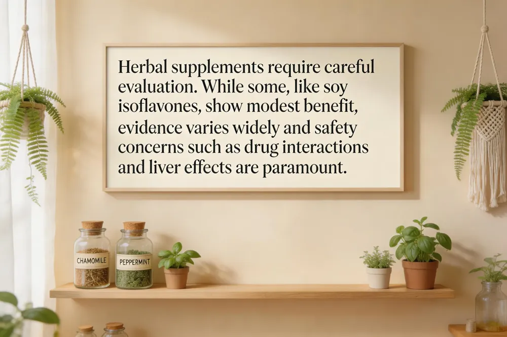 Evidence for holistic supplements in menopause support is mixed and requires careful evaluation. Soy isoflavones (50-100 mg daily) have the most consistent, though modest, data for reducing hot flash frequency and improving vaginal dryness. Black cohosh (e.g., Remifemin) may offer short-term relief for hot flashes but carries potential liver safety concerns. Red clover isoflavones show inconsistent results. For mood and sleep, St. John's wort has evidence for mild depression but has numerous dangerous drug interactions. It is crucial to understand that supplements are not FDA-regulated for safety or efficacy, quality varies widely, and they are generally less effective than hormone therapy for severe symptoms. Consultation with a knowledgeable healthcare provider for a personalized risk-benefit assessment is essential before starting any supplement.